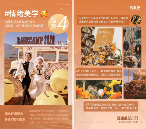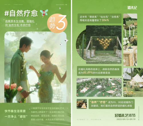 趋势表明,在婚礼形式方面,当代年轻人更倾向于新潮、新颖的婚礼形式,低碳环保、氛围感满满的目的地、露营等婚礼涌现,形态多样;在婚礼创意方面,Z世代办婚礼有自己的想法和态度,追求与众不同、不一样的结婚新体验,婚礼跟随本心,像“避世者”小众有调,“追潮派”张扬猎奇,“艺术家”讲究创意等;在婚礼精神层面,在Z世代的眼里,婚礼已不再是一场单纯的仪式,而是能承载个性与情绪的,且一定程度上能承载悦己、疗愈的精神和审美价值的载体,“自然”、“疗愈”成为95、00后结婚热门关键词。另外,在疫情反复下,政策主张婚礼简办,年轻人备婚追求快速搞定,人数少、落地快的轻婚礼形式受追捧。