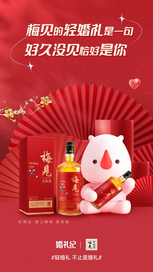 作为中国最畅销的青梅酒品牌,梅见瞄准结婚市场,基于年轻人婚礼重新审视传统文化与审美,以及新生代人群的饮酒态度,推出根植于中国古雅文化的地道“中国梅酒”。这一雅俗共赏,又极具意趣的饮品,无比契合了轻婚礼的“文化自信”。数据表明,95后更偏爱“新中式婚礼”,热衷于将传统文化注入潮流灵感。而梅见借力东方美学,聚焦轻婚礼的婚宴场景,开创了雅饮的品味方式先河,推出【红梅见-喜上梅梢 宴庆版】产品系列。“喜鹊登梅”自古就是喜庆吉祥的图纹,鹊上枝头,好梦圆圆,喜上眉梢,好事连连。加之青梅酒味酸甜清爽,喝一杯喜庆的滋味,爽快加倍。梅见将梅酒变成编译和表达传统婚礼文化的显性载体,汲古融今,让年轻人的轻婚礼更彰显文化自信。
