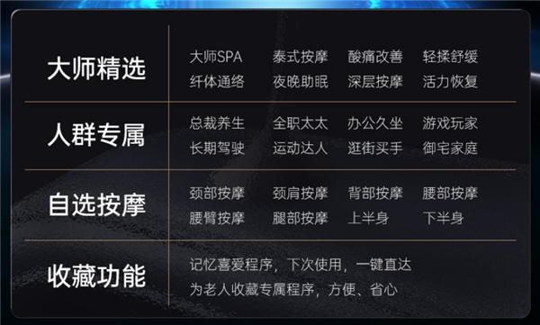 针对各个部位和不同需求场景,研发定制24套专业按摩程序,包含8套大师精选程序,8套人群专属程序和8套不同部位局部按摩程序,给用户更精细的专业按摩护理。还有手动程序收藏功能,下次使用一键直达,无需重新调配,可以为父母老人设定收藏专属模式,更加方便省心