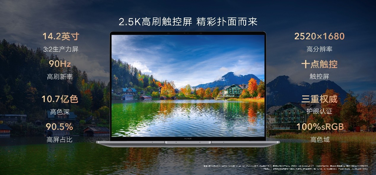 荣耀MagicBook V 14 2022搭载了2.5K高刷触控3:2生产力屏幕,通过国家眼科工程中心护眼认证、莱茵低蓝光护眼认证以及莱茵无屏闪护眼认证,100%的sRGB高色域和10.7亿色高色深保证画面绚丽逼真,90.5%的超高屏带来沉浸式观感。
