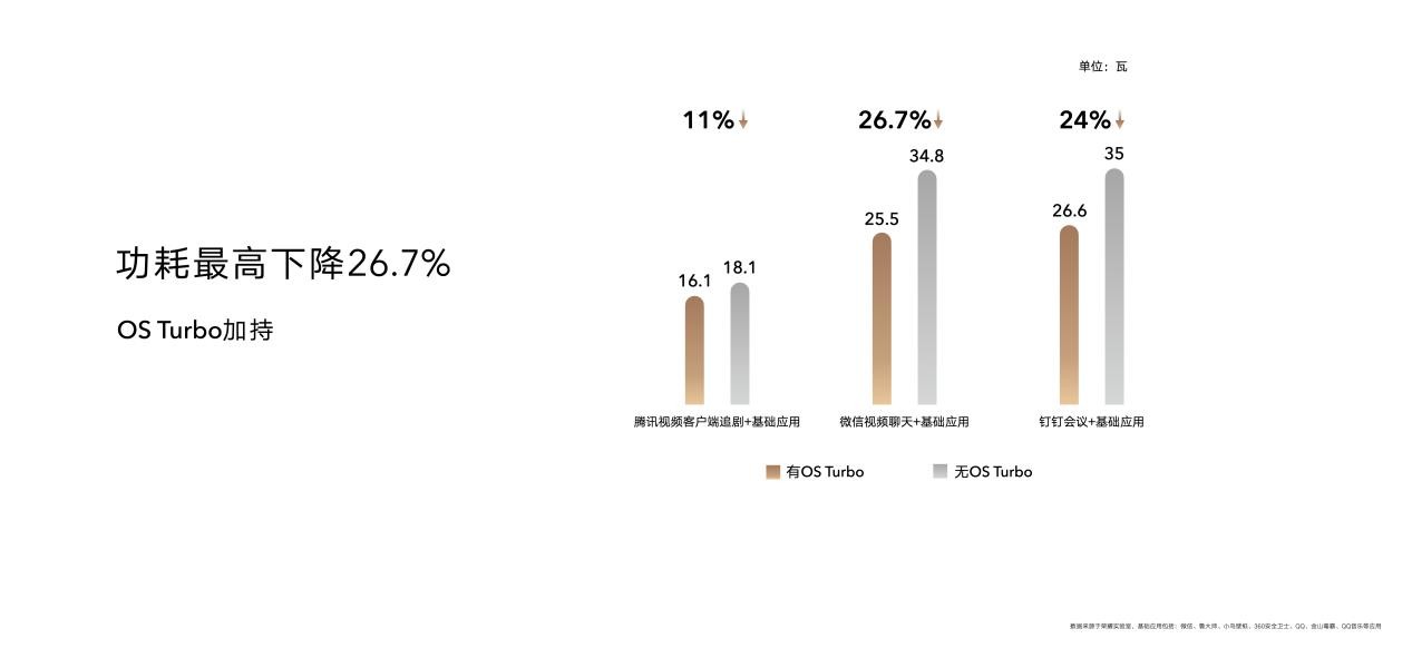 在荣耀OS Turbo系统级性能和功耗优化引擎的加持下,实现了性能更优,功耗更低的表现:荣耀MagicBook V 14 2022 在钉钉会议、腾讯视频客户端追剧以及微信视频聊天等日常场景下,功耗最高下降达26.7%;而整机的续航时长对比竞品最高可以提升73.4%,配合60Wh大容量电池,续航能力得到有效提升。