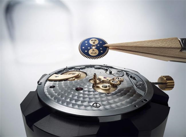 2 点钟位置设阿拉伯数字月相显示,5 点钟位置为小秒盘,10 点 30 分位置为动力储存显示