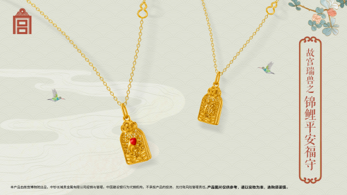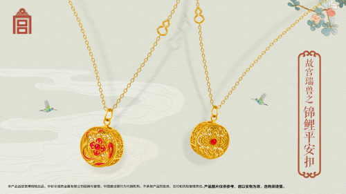 “故宫瑞兽”系列之四遴选了麒麟、锦鲤两种瑞兽——麒麟,寓意国泰民安、天下太平,为大安之象;锦鲤,象征一生平安、幸福愉悦,为小安之兆。根据主体形态及瑞兽元素的不同,本季分为三款文创首饰,分别是“故宫瑞兽之锦鲤平安扣”“故宫瑞兽之锦鲤平安福守”两款项链和“故宫瑞兽之麒麟平安锁”手绳。